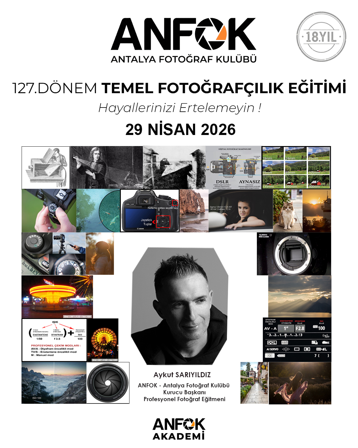 Antalya’nın fotoğraf belleğini oluşturan ANFOK, 18. yılında kapılarını 127. kez büyük bir heyecanla açıyor! Bugüne kadar binlerce fotoğraf sevdalısını mezun eden ANFOK Akademi, Kurucu Başkanımız Aykut Sarıyıldız rehberliğinde sizi de bu köklü ailenin bir parçası olmaya davet ediyor.