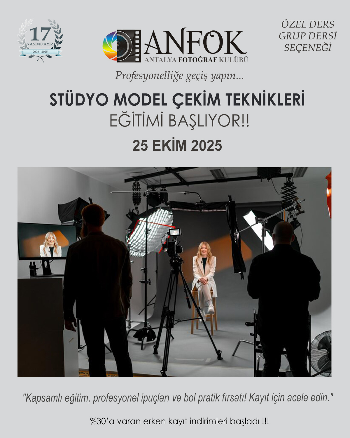Merhaba arkadaşlar yepyeni bir eğitim ile sizlerleyiz.Stüdyo Model Çekim Teknikleri Eğitimi 25 Ekim 2025 cumartesi günü başarılı Stüdyo Fotoğrafçısı Tolga Kavas eşliğinde başlıyor.Stüdyoda Model çekimlerinin tüm ayrıntılarını bu eğitim de bulabilirsiniz.